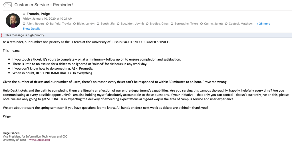 This was sent to me on a Friday in reference to a help desk ticket that had been submitted on a Monday. The ticket had been met with no response. If there’s one thing I feel strongly about, it’s customer service. And I know I get bashed for using the word ‘customer’ in higher education. But it’s the best word I can find that everyone understands and can relate to. When I joined TU, I recognized pretty quickly – and was told first-hand – that, within IT, customer service and timely response had not previously been a priority. I also documented an alarming history of lack of training, interaction and sometimes even management of staff within IT. This is basic stuff. As a new hire, it’s important for me to not react with fire and brimstone. To give folks a hand up not an immediate wave goodbye. So we’ve spent six months shifting, defining, teaching, discussing. We’ve reallocated and combined positions to allow to help fill critical gaps, one being a high-level leadership position focused almost solely on prioritizing and delivering excellent customer service. Spring 2020 is the semester of growth in this area. We will do better. And we’re so honored to be able to serve in this capacity.Here are my internal thoughts on this, to our team. Not my first communication and not my last. It’s critical for us: